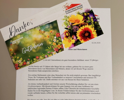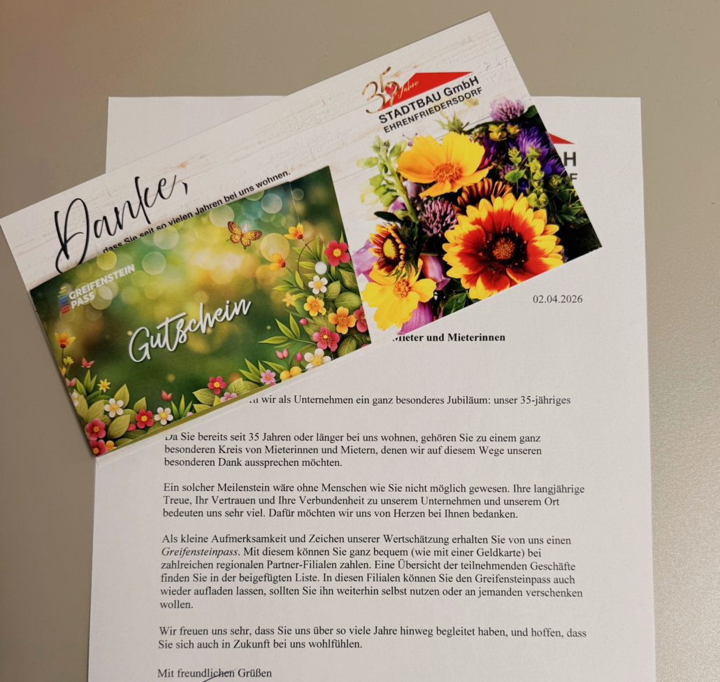Dafür möchten wir heute von Herzen Danke sagen. Ihre Treue, Ihr Vertrauen und Ihre Verbundenheit bedeuten uns unglaublich viel. Als kleines Zeichen unserer Wertschätzung haben wir unseren langjährigen Mietern einen Greifensteinpass mit einem Startguthaben überreicht. Eine Geste, die nur ansatzweise ausdrücken kann, wie dankbar wir sind.